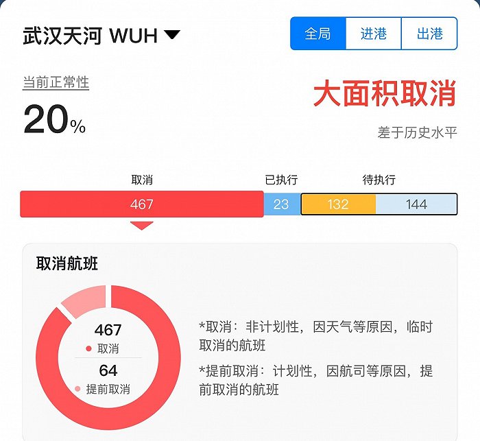而此前一天即2月3日,武汉天河机场也出现了航班大面积取消情况,机场流量正常率仅为25%,进港取消航班164架次、出港取消航班200架次。
