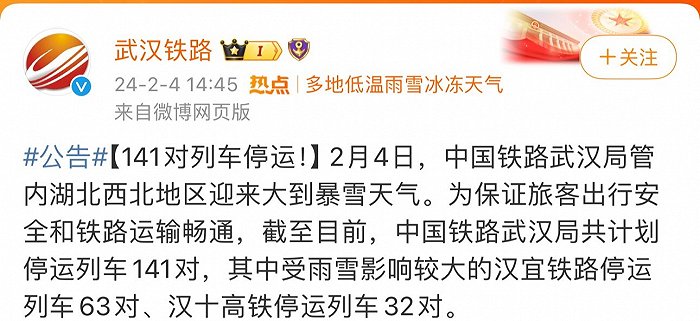 除了航空方面,冰冻雨雪天气也导致列车大范围停运。据中国铁路武汉局集团官方微博消息, 2月4日,中国铁路武汉局管内湖北西北地区迎来大到暴雪天气。截至目前,中国铁路武汉局共计划停运列车141对,其中受雨雪影响较大的汉宜铁路停运列车63对、汉十高铁停运列车32对。
