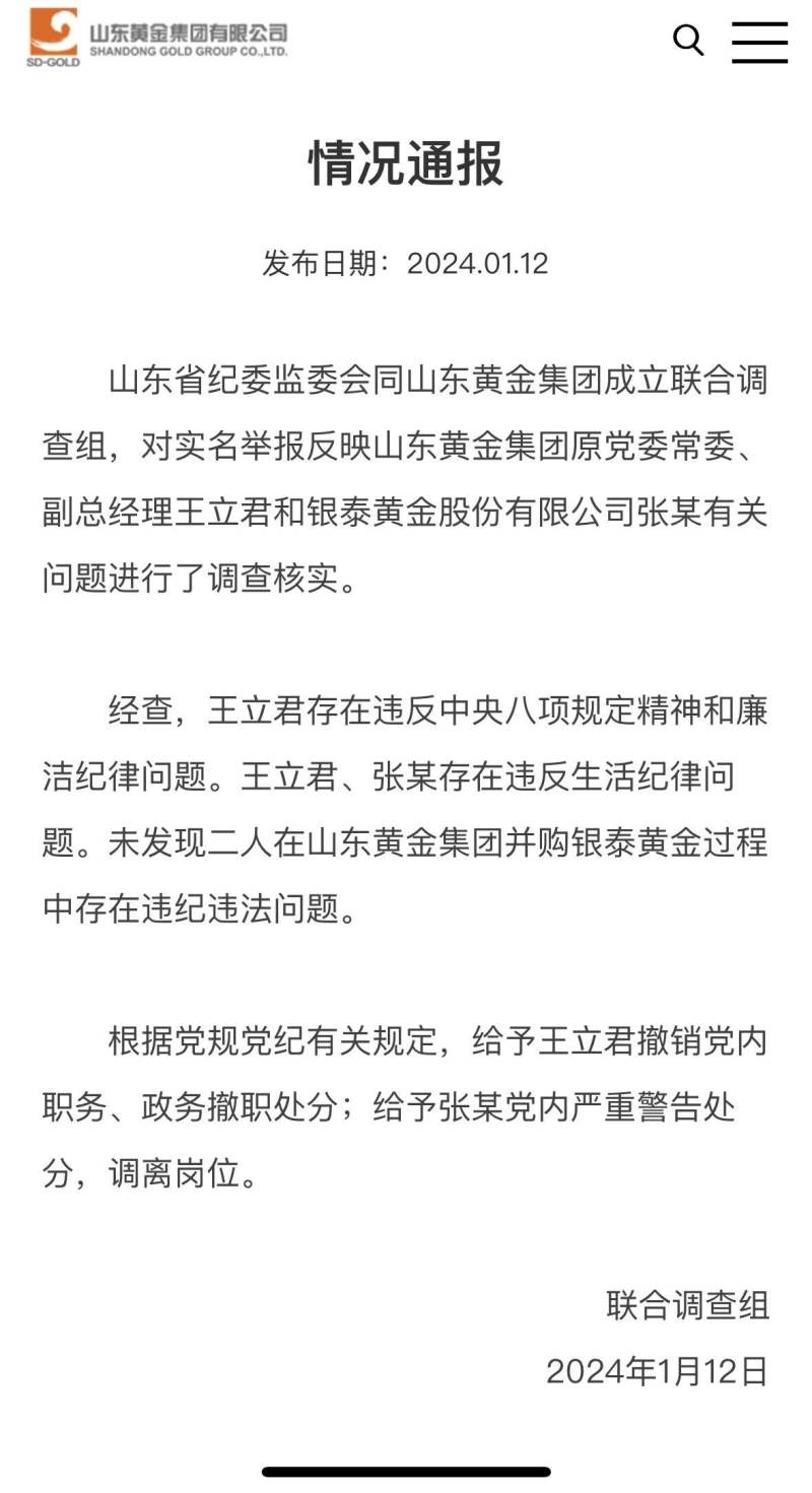新京报讯据山东黄金集团网站消息,山东省纪委监委会同山东黄金集团成立联合调查组,对实名举报反映山东黄金集团原党委常委、副总经理王立君和银泰黄金股份有限公司张某有关问题进行了调查核实。