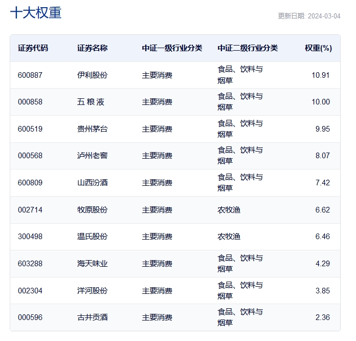 数据显示,截至2024年2月29日,中证主要消费指数(000932)前十大权重股分别为伊利股份(600887)、五粮液(000858)、贵州茅台(600519)、泸州老窖(000568)、山西汾酒(600809)、牧原股份(002714)、温氏股份(300498)、海天味业(603288)、洋河股份(002304)、海大集团(002311),前十大权重股合计占比69.96%。