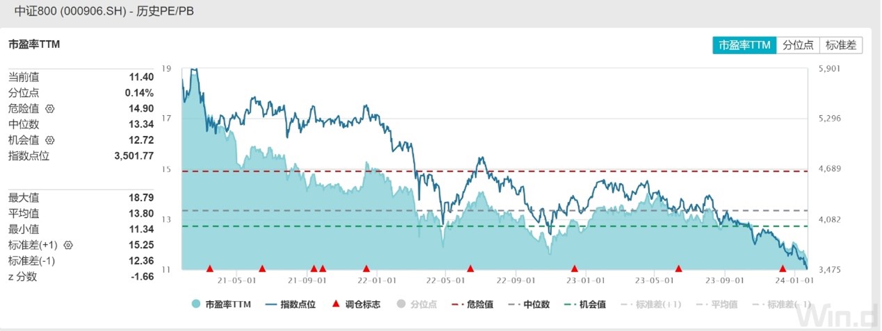 从估值角度看,800ETF(515800)标的指数(中证800指数)当前PE-TTM仅为11.40倍,低于过去5年99%以上的时间区间,绝对估值和相对估值均位于历史极低区间,性价比凸显!(数据来源:Wind,截至2024.01.24)